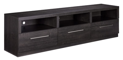 Stylish Storage. With its sleek modern design and charcoal colouring, the Aiden is the perfect addition to any contemporary living room looking for storage optimization. Media players and gaming consoles fit perfectly in the Aiden’s ample slots, and the deep drawers provide the perfect space for general storage. Avoid clutter and add some classic style to your living room with the Aiden.Product Dimensions: Depth: 18", Height: 22", Width: 80",