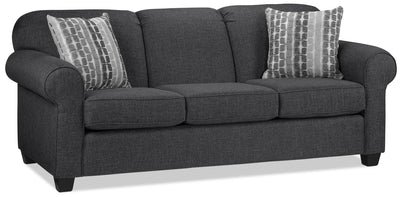 Suits You. The Aristotle sofa in graphite is distinguished by its rich grey blended fabric. This tweed-like upholstery possesses the refinement of a designer charcoal suit. Tight-back styling and box seat cushions with welted trim add to this tailored aesthetic. Supportive roll arms lend comfort and a casual touch. A perfect fit for a modern or more traditional living room, this classic contemporary look dresses up your décor. Made in Canada.Product Dimensions: Depth: 38", Height: 36", Width: 83.5",
