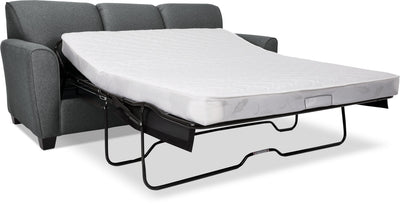 Upgrade your living room with the versatile and stylish Ashby Queen Sofa Bed, designed to bring both comfort and functionality to your home. Crafted with a strong fibre blend of two durable fabrics, this sofa bed is built to handle the demands of a busy household while maintaining its sleek, polished look. The dark grey upholstery features a tweed-like texture, adding a custom touch to your living space. Cream and grey toss pillows with a modern print offer a stylish pop of contrast, enhancing the overall aesthetic. With tight-back styling and welted box cushions, this sofa bed delivers a tailored appearance, while a supportive headrest ensures lasting comfort—ideal for movie nights or everyday lounging. Perfect for hosting overnight guests, the Ashby Queen Sofa Bed includes a firm uni-deck mattress pad that offers deep-down support for restful sleep. When not in use, the queen-size mattress neatly tucks away, transforming back into a sleek, modern sofa that’s as practical as it is invitingProduct Dimensions: Depth: 35", Height: 36", Width: 84",