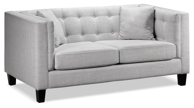 Give Me Shelter. The shelter-arm design is a staple of mid-century modern aesthetics and it lends the Astin loveseat a tailored, elegant look. Upholstered in light grey, linen-like fabric that's easy to clean, the frame is supported by richly coloured, tapered feet for a contemporary touch. Modern comforts to match this updated classic include springs in the seats and backs, supportive foam and loose seat cushions. Finally, the tufting along the seat backs and inside of the arms makes the Astin completely stylish, chic and the perfect place to take shelter. Loveseat includes two toss pillows only. Made in Canada.Product Dimensions: Depth: 34", Height: 28", Width: 63",