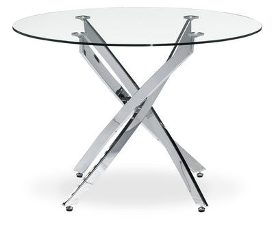 Mod Dining. The Atlantis table gives your home a chic upgrade with its sleek, no-frills design. Featuring a compact size that's perfect for tight spaces, this piece boasts modern flair with its lustrous finish. A glass tabletop sits atop a striking, X-shaped chrome base for an elegant look that takes centre stage in your room. The intimate, round shape encourages friendly conversation, turning daily dinners into family bonding time. Customer assembly required.Product Dimensions: Diameter: 43", Height: 30",