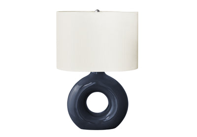 Add some modern ambiance to your home with this stylish and trendy 24" table lamp in blue ceramic with a chic ivory shade. This decorative table lamp will brighten up any room with its contemporary, donut-shaped ceramic base and oval linen-blend fabric shade. A perfect size to place on an end or side table, or as a bedside lamp on your nightstand, this lamp will illuminate your space with a soft and inviting glow. Easy to use with an on/off rotary switch that houses a 100W light bulb (not included), this lighting fixture will easily be a standout. With only minimal assembly needed and backed with a 2 year limited warranty against manufacturer defects, you can trust in the quality and durability of this unique accent piece.Product Dimensions: Depth: 16", Height: 24", Length: 7", Width: 11",