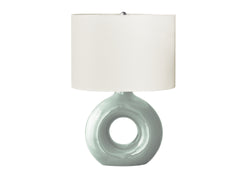 - A contemporary and stylish 24"H table lamp featuring a trendy, donut-shaped, light green ceramic base topped with an oval, ivory fabric shade and a round silver metal finial.