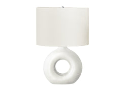 - A contemporary and stylish 24"H table lamp featuring a trendy donut-shaped, matte white ceramic base, topped with an oval, ivory fabric shade and a round silver metal finial.