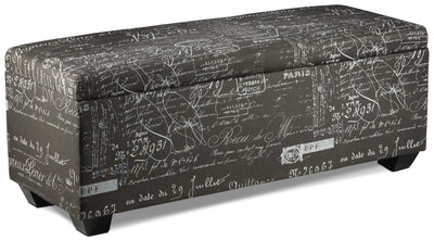 French Flourish. Make your space très chic with the addition of the generously sized Boardwalk storage ottoman. An aged script print on grey upholstery calls to mind the shops of Paris, and is as effortlessly stylish as the City of Light itself. In addition to providing extra seating or a place to put up your feet, the hinged top opens to reveal extra storage space. Equally well-suited for French country or contemporary décor, this piece is fantastique! Customer assembly required.Product Dimensions: Depth: 17", Height: 16", Width: 45",
