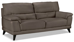 The Braylon sofa brings plush comfort and ultra-contemporary style to your living room. An African grey finish, designer stitching and rich, espresso-coloured legs make the perfect addition to most any décor. Overstuffed cushions and high-density seats combine for comfort that lets the worries of the day melt away.