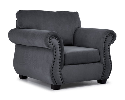Experience the elegant and vintage style of the Brooklyn Chair. Upholstered in plush, modern corduroy fabric in a stylish grey, this chair will add a touch of vintage flair to your home. With the elegant, rolled arms to keep your arms comfortable and the nailhead detail that enhances the vintage look, this chair is both a stunning and comfortable piece. The no-sag springs with eight-gauge steel on the seat and 11.5-gauge steel on the back provide support. The loose seat cushion with 2 lb. density foam offers extra comfort and makes cleaning easy, as the cushion can be rotated. With its hardwood and composite wood frame, this chair ensures strength and durability for years to come. Beautifully designed to complement any modern or vintage living room décor, so you will always be able to enjoy the comfort and aesthetic of this chair. Proudly made in Canada, the Brooklyn Collection blends classic design with Canadian craftsmanship. Enjoy lounging, reading, or chatting with friends and family on the Brooklyn Chair.Product Dimensions: Depth: 37", Height: 36", Width: 43",
