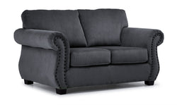Experience the elegant and vintage style of the Brooklyn Loveseat. Upholstered in plush, modern corduroy fabric in a stylish grey, this loveseat will add a touch of vintage flair to your home. With the elegant, rolled arms to keep your arms comfortable and the nailhead detail that enhances the vintage look, this loveseat is both a stunning and comfortable piece. The no-sag springs with eight-gauge steel on the seat and 11.5-gauge steel on the back provide support. The loose seat cushions with 2 lb. density foam offers extra comfort and makes cleaning easy, as the cushions can be rotated. With its hardwood and composite wood frame, this loveseat ensures strength and durability for years to come. Adding to the vintage flair are two toss pillows perfectly blending in with the aesthetic of this loveseat. Beautifully designed to complement any modern or vintage living room décor, so you will always be able to enjoy the comfort and aesthetic of this loveseat. Proudly made in Canada, the Brooklyn Collection blends classic design with Canadian craftsmanship. Enjoy lounging, reading, or chatting with friends and family on the Brooklyn Loveseat.