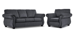 Experience the elegant and vintage style of the Brooklyn Sofa, and Chair Set. Upholstered in plush, modern corduroy fabric in a stylish grey, this sofa & chair set will add a touch of vintage flair to your home. With the elegant, rolled arms to keep your arms comfortable and the nail head detail that enhances the vintage look, this sofa & chair set is both a stunning and comfortable piece. The no-sag springs with eight-gauge steel on the seat and 11.5-gauge steel on the back provide support. The loose seat cushions with 2 lb. density foam offers extra comfort and makes cleaning easy, as the cushions can be rotated. With its hardwood and composite wood frame, this sofa & chair both ensure strength and durability for years to come. Adding to the vintage flair are two toss pillows perfectly blending in with the aesthetic of this set. Beautifully designed to complement any modern or vintage living room décor, so you will always be able to enjoy the comfort and aesthetic of this sofa & chair set. Proudly made in Canada, the Brooklyn Collection blends classic design with Canadian craftsmanship. Enjoy lounging, reading, or chatting with friends and family on the Brooklyn Sofa and Chair Set.