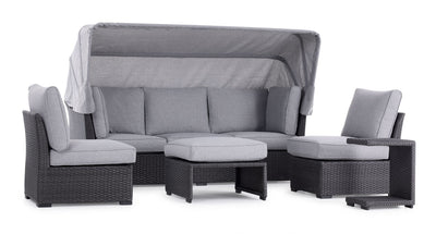 You’re going to wish you could spend all day, every day outdoors when you experience the comfort, quality and versatility of our Caprie daybed. Rust-free powder-coated aluminum frames serve as a sturdy foundation for handwoven 100% recyclable resin wicker. Made to mimic the look and feel of natural wicker, this synthetic version is actually more durable, easy-to-maintain, and weather resistant. The cushions are upholstered in an ultra-soft, solution-dyed polyester fabric that’s double stitched for strength. Modular components, including armless chairs, an ottoman and a c-shaped end table, allow you to create the perfect seating arrangement. The set also features a retractable cover, so you can sunbathe or seek shade whenever you want.Product Dimensions: Depth: 63", Height: 32.75", Width: 86.75",