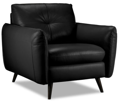 Elevate your living space with our sophisticated black chair, boasting timeless elegance and modern comfort. The bold, yet neutral colour will draw the eye and add style to your home. The rounded armrests and slanted backrest offer an inviting silhouette, perfect for relaxation. Enhanced by double tufting and accentuated stitching, the backrest exudes luxury and style, adding a touch of refinement to any room. Supported by sleek, slanted wood legs with an espresso finish, this chair strikes the perfect balance between chic design and sturdy construction. Whether you're curling up with a book or entertaining guests, this exquisite piece seamlessly blends comfort and style, making it a must-have addition to your home décor. Show off your elegant taste with the Carlino Chair.Product Dimensions: Depth: 36", Height: 33", Width: 36",