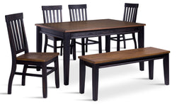 Update your dining space with Caylie Noir, this farmhouse styled set gives classic cottage styling a modern take by combining clean lines with a two-tone ebony and driftwood finish. A 59.5-inch table easily accommodates six guests and pairs beautifully with either contoured schoolhouse styled chairs or tapered-leg bench that can be mixed or matched to fit your own personal style.