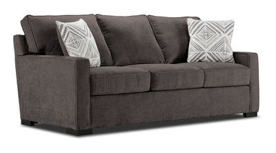 Stylish by day, dreamy by night—the Charlotte Full Sofa Bed in Pewter is your new go-to for both lounging and hosting. Designed in a soft, versatile neutral, this modern sofa blends seamlessly with any décor, adding a touch of contemporary charm to your living room, guest room, or den. Built with both beauty and durability in mind, the Charlotte sofa bed features a solid foundation of kiln-dried hardwood and engineered wood, with reinforced corner blocks, glued and stapled joints, and expert Canadian craftsmanship. The result? A sofa bed that's as sturdy as it is stunning. Plush attached back cushions, sleek track arms, and a crowning seat give this sofa bed its timeless silhouette, while impeccable tailoring adds a refined finish. And when it’s time for guests, this sofa quickly transforms into a cozy sleep space featuring a deluxe gel mattress—designed for exceptional comfort and support so visitors rest easy and wake refreshed. Under the seat, 8-gauge sinuous steel springs and double-sprung corners ensure long-term comfort, structure, and support—even with daily use. Whether you’re binge-watching your favourite shows or setting up for overnight guests, the Charlotte sofa bed delivers on comfort, function, and effortless style. Proudly made in Canada, the Charlotte Full Sofa Bed is more than a smart solution—it’s a statement of quality, designed to last and built to impress.Product Dimensions: Depth: 37", Height: 38", Width: 86",