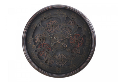 Add some sophistication to your home decor with this stunning 30" round wall clock with an exposed gear mechanism. The sleek black plastic frame on this large, oversized clock surrounds a clear glass surface showcasing the metal gears in motion, for a stylish look to any home decor. This non-ticking decorative clock features a quartz movement for accurate timekeeping without sound, while the analog display makes it easy to read at a glance. With no assembly required, this clock is powered by 3 aa batteries (not included), and backed by a 2 year limited warranty against manufacturer defects. You can trust the quality and craftsmanship of this transitional timepiece while adding a touch of sophisticated vintage to your decor. For indoor use only.Product Dimensions: Depth: 4", Height: 30", Width: 30",
