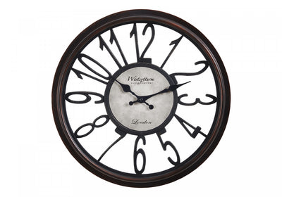 Add a hint of vintage vibes to your home decor with this beautiful 16" round wall clock in an antique brown finish. The transitional design features a light and sturdy brown plastic frame with a rubbed antique finish and a clear glass surface over the open, easy to read numerical display. The nostalgic stamped print in the center and black metal hands makes it both a decorative and highly functional accent piece. The quartz movement ensures accurate timekeeping, requiring only 1 aa battery (battery not included) with no assembly required. Perfect for quiet environments with its non-ticking mechanism and modern skeleton design, this simple analog clock is suitable for all home decor styles. Complimented with a 2 year limited warranty against manufacturer defects for your satisfaction, ensuring a long-lasting quality purchase. For indoor use only.Product Dimensions: Depth: 1.75", Height: 15.75", Width: 15.75",
