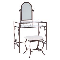 The glamorous Clarisse vanity set is a dual-purpose piece that boasts elegant decorative accents while operating as a highly functional vanity. The bronze-finished metal frame complemented by ornamental scrollwork offers a chic touch to your dressing area. With a sturdy glass tabletop and storage shelf, you’ll have all the room you need to organize your beauty supplies. The arched mirror is adjustable so you can always find the perfect angle and lighting when doing your hair or make-up. The cozy stool is upholstered in linen-like fabric which is a breeze to clean, and even the glass countertop only requires a damp cloth to wipe down. Occupying minimal space and requiring marginal maintenance, your memorable nights will begin with the sophisticated Clarisse vanity set.