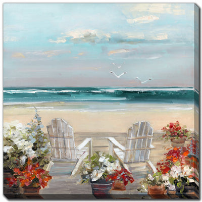A relaxing scene of a coastal patio, framed with flowers and a calm ocean backdrop. This piece invites leisure and brings soft, refreshing beach energy to any wall.Product Dimensions: Depth: 1.5", Height: 38", Width: 38",