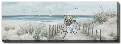 Bicycle with basket of yellow flowers on beach boardwalk . Captivating piece of art that brings life and creativity to your home. Highlighted with clear and crisp design lines, the art signifies quality and style. Bring home this piece to add a little extra dash of colour and warmth to any spaceProduct Dimensions: Depth: 1.5", Height: 20", Width: 60",