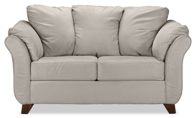 A Flair to Remember. With its distinctive profile, the Collier loveseat will be at home in any well-designed room. The combination of flared arms and legs give this piece a unique silhouette, and the soothing light grey microfibre is smooth and luxurious. Overstuffed cushions, padded arms and no-sag springs serve as a perfect path to comfort. Made in Canada. Special order item. Please allow approximately 8-10 weeks for delivery.Product Dimensions: Depth: 37", Height: 39", Width: 68",