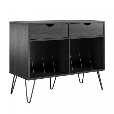 Add a blast from the past with the Novogratz Concord Turntable Stand with Drawers. Inspired from mid-century design, the laminated particleboard and MDF complement the metal hairpin legs for a fun retro look. The double wide record stand offers plenty of space to place a record player, speakers, and stereo or even decorations. Keep your remotes, cassette tapes, and record mats or weights for your singles stored away and organized in the 2 drawers. The drawer cutout gives the stand a clean, no-handle look that is easy to open. Keep all of your albums organized in large open cubbies that feature metal record dividers to keep all of your albums upright. The Novogratz Concord Turntable Stand with Drawers ships flat to your door and 2 adults are recommended for assembly upon opening. The stand can hold up to 60 lbs. While the cubbies will hold 20 lbs. Each. Each drawer can hold up to 15 lbs. Upon assembly, the stand measures to be 31.8" H x 39.7" W x 18" D.Product Dimensions: Depth: 18", Height: 32", Length: 18", Width: 39.75",