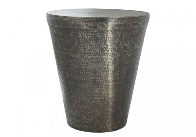 Spruce up your home with this fashionable and contemporary silver grey metal end table. Hand-crafted in iron metal with a hammered pattern on all sides, the sleek architectural lines on this 22" high cone-shaped drum table would be a stand-out in modern or transitional style rooms. The compact, space saving design makes it easy to tuck this as a side table or end table in a living room, with enough space on top for a lamp or decorative object. For a luxurious and elegant look, bring it into the bedroom as a nightstand. No assembly is required, so no need to set aside time to put it all together, just take it out of the box and enjoy the beauty it will bring to your space. Durably designed with high quality metal for long lasting use, this practical accent table comes with a 5 year limited warranty against manufacturer's defects. For indoor use only.Product Dimensions: Diameter: 20", Height: 22",