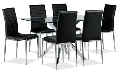 Transform your dining space with this stunning Darron 7-Piece Dining Set in Black. Designed to bring style, sophistication, and comfort to every meal. The sleek tempered glass tabletop creates an airy, open feel, making your space look brighter and more inviting. Its smooth, flush edges provide a seamless finish, ensuring safety without compromising on elegance. The bold, sculptural base adds a contemporary touch, making this table a true statement piece. Crafted with durability in mind, the table features a sturdy steel frame with secure welds, ensuring long-lasting strength and stability. The matching chairs, designed with precision stitching and an eye-catching frame, offer both resilience and refined style. Their well-cushioned seats provide exceptional comfort, allowing you to enjoy leisurely meals with family and friends. With its perfect balance of modern aesthetics and practical design, this dining set effortlessly enhances any home. Some assembly required—create your perfect dining setup with ease.Product Dimensions: Depth: 55", Height: 30", Width: 34",