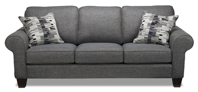 Modern Day Grey. The grey Drake sofa puts today's hottest neutral on display! The grey finish and contemporary design elements create a flexible look that you can easily customize with your own personal touches. Ample, angled roll arms and semi-attached back cushions provide plenty of plushness and full visual appeal. Black, white and grey accent pillows and richly toned wedge feet ground this sofa in chic modern times. Made in Canada.Product Dimensions: Depth: 39", Height: 39", Width: 89",