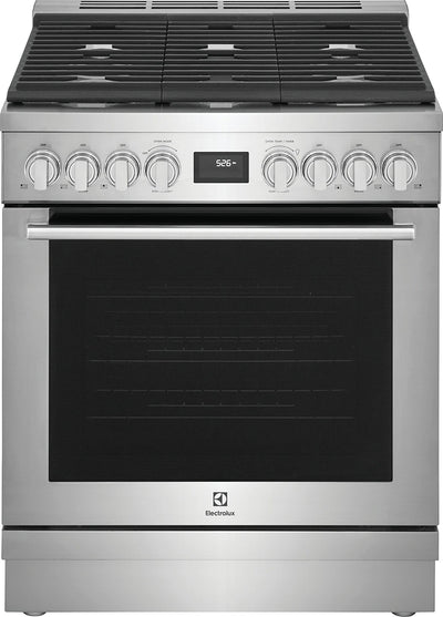 Indulge in culinary mastery with the Electrolux Stainless Steel Freestanding Dual-Fuel Range, where the seamless blend of gas cooktop and electric oven makes creating culinary masterpieces an exquisite experience. Elevate every dish with Two Dual Brass Power Burners, delivering precise control from simmering sauces to a powerful, rolling boil. Let the unique oval burner with two temperature zones transform your griddle game, allowing multiple foods to sizzle to perfection side by side. True Convection technology brings consistency and precision, ideal for delicate soufflés or savoury roasts, enveloping your creations in even heat for flawless results every time. And with sturdy, continuous grates, you can effortlessly slide pots and pans from burner to burner, enjoying a refined, unified cooking surface that enhances both style and function. Ready to inspire creativity and elevate your kitchen, this Electrolux Dual-Fuel Range promises to make every meal a memorable one, where your passion for cooking meets the art of control and precision.Product Dimensions: Depth: 26", Height: 36.75", Width: 30",