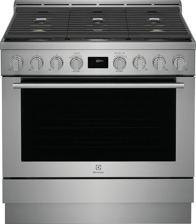 Turn every meal into a masterpiece with the Electrolux Stainless Steel Front Control Freestanding Gas Range, where precision and versatility meet to inspire your culinary creativity. With True Convection, three heating elements and a fan work in harmony to deliver consistent heat, perfecting delicate pastries and rich, hearty roasts alike. The two Dual Brass Power Burners make every simmer, sear, and boil effortlessly controlled, adapting smoothly to each recipe's demands. Hosting is a breeze with six dual burners that let you cook multiple dishes at once, bringing harmony to every meal preparation. Continuous grates enable pots and pans to glide smoothly across the cooktop, while adding a sleek, cohesive look to your range. The integrated Temperature Probe takes the guesswork out of cooking, ensuring your proteins reach juicy perfection every time by alerting you at the precise moment they’re done. Designed to elevate both your kitchen’s style and your passion for cooking, this Electrolux range is ready to make every dish shine.Product Dimensions: Depth: 26", Height: 36.75", Width: 36",