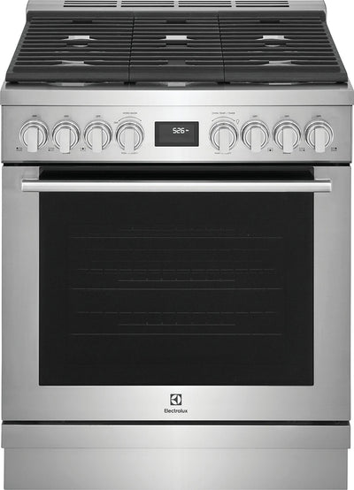 Transform your kitchen into a culinary haven with the Electrolux Stainless Steel Front Control Freestanding Gas Range, designed for passionate cooks and unforgettable meals. True Convection’s three heating elements, paired with a fan, deliver flawless heat distribution for pastries as delicate as morning dew or roasts with deep, satisfying flavours. Revel in the precision of two Dual Brass Power Burners, where a gentle simmer or fierce boil is always at your fingertips, bringing harmony to each recipe. The unique oval burner, with its dual temperature controls, is perfect for griddling multiple dishes at once—ensuring every bite is rich with flavour. Continuous grates let you glide even the heaviest pots, while adding a sleek, unified look to your cooktop. And with an integrated Temperature Probe that alerts you when proteins reach perfection, you’ll never second-guess your culinary creations. Each feature on this range promises not just food, but a symphony of tastes crafted with finesse and passion.Product Dimensions: Depth: 26", Height: 36.75", Width: 30",