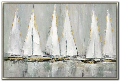 This abstract representation of sailboats, with soft white and gold tones, brings a serene coastal vibe. Ideal for modern or coastal decor, the gentle colours and minimalist style make it both elegant and soothing.Product Dimensions: Depth: 1.5", Height: 31", Width: 46",