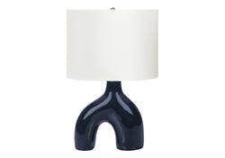 - A contemporary and stylish 25"H table lamp featuring a unique two-leg shape blue ceramic base, topped with a classic ivory fabric shade and a round silver metal finial.