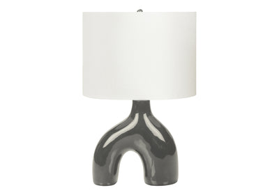 Add a fun and decorative element to your home with this stylish, mid-century inspired 25" table lamp in dark grey ceramic with an elegant linen ivory shade. This decorative table lamp will brighten up any room with its contemporary and whimsical two-leg shape ceramic base and linen-blend fabric shade. A perfect size to place on an end or side table in your living room or office, or as a bedside lamp on your nightstand in your bedroom, this lamp will illuminate any space with a soft and inviting ambiance. Easy to use with an on/off rotary switch that houses a 100W light bulb (not included), this lighting fixture will be a standout in your space. Only minimal assembly is needed and backed with a 2 year limited warranty against manufacturer defects, you can trust in the quality and durability of this unique accent piece.Product Dimensions: Depth: 16.5", Height: 25.25", Length: 6", Width: 11",