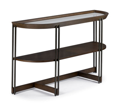 The Elora Oval Sofa Table brings modern elegance and practicality to your living space. With a 5 mm clear glass top and straight edge insert, it offers a sleek surface that enhances the table’s rich walnut wood finish. The combination of walnut and tarnished silver in the metal legs adds a sophisticated industrial charm that complements various décor styles. A fixed middle shelf provides convenient storage for books, décor, or everyday essentials, while the wood stretchers ensure stability and durability. This versatile sofa table is perfect for placing next to a sofa or armchair, offering both style and functionality. The levelers on the table legs ensure a steady balance, even on uneven floors, giving you peace of mind with its stability. Ideal for any contemporary or transitional living space, the Elora oval sofa table is a refined addition that enhances your room with its chic design and useful storage.Product Dimensions: Depth: 15", Height: 29", Width: 50",