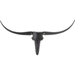 This traditional animal skull statue is infused with industrial design influences. Artistic perspective reduces the anatomy of the animal wall decoration to a series of simplified shapes, with sculptural aluminum metalwork that forms the sleek silhouette of the head and elongated antlers. Finished in bronze, the wall art’s classical farmhouse figure feels fresh above a fireplace mantle.
