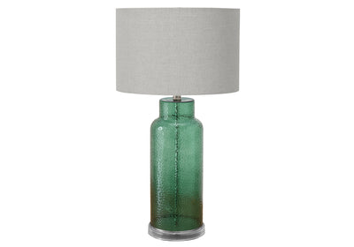 - This contemporary, 28"h table lamp features a textured, translucent green glass body on a clear acrylic base and topped with a sophisticated grey fabric shade, making it a stylish accent in a living room, bedroom, or home office space.