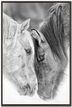 The intimate black-and-white close-up of two horses nuzzling each other captures a moment of quiet affection. The monochromatic palette creates a timeless and elegant piece that adds sophistication and emotional depth to a space. Ideal for a living room or entryway.