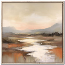 This abstract landscape with a river winding through earthy tones and soft skies captures the peacefulness of dawn. Ideal for modern or rustic spaces, it adds warmth and depth to a room.