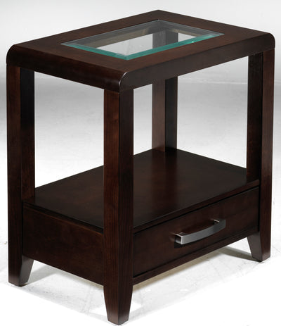 Happiness Unlimited. The Felicia end table will leave you with a positive vibe due to its compact size and sleek modern style. You'll be able to fit this table most anywhere in your home, as it measures around two feet in width, depth and height. Its eye-catching bevelled glass insert provides style and lets you see through to the bottom shelf and drawer, which offer convenient storage options. Customer assembly is required.Product Dimensions: Depth: 15", Height: 26", Width: 24",