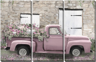 Pink vintage farm truck laden with pink and white wildflowers against a brick farm structure. Captivating piece of art that brings life and creativity to your home. Highlighted with clear and crisp design lines, the art signifies quality and style. Bring home this piece to add a little extra dash of colour and warmth to any spaceProduct Dimensions: Depth: 1.5", Height: 30", Width: 45",