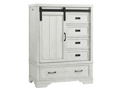 - Foundry White Dove chifferobe has four small drawers, one large drawer, one door compartment with two adjustable shelves inside, and a pull out wardrobe rod