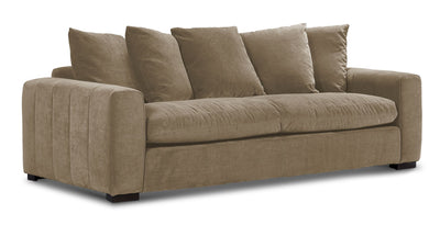 Add the timeless style of old-fashioned luxury to your home with the Frazer Sofa. Covered in a beautiful velvet-like fabric, this sofa will quickly become a staple in your space. Style it with other earth tones or make it the pop of colour—this couch is sure to complement any home décor. The seat and back cushions are filled with a premium 50% feather and 50% loose fibre blend, creating luxurious softness and the perfect balance of coziness and support. The seat cushions also feature high-density foam layered with feather and fibre fill, delivering long-lasting comfort, reliable support, and excellent shape retention. The backrest is reinforced with durable rubber webbing for consistent support, enhanced comfort, and long-term structural integrity—ideal for daily use. Wide track arms, sleek lines, and deep seating add to the luxurious feel of this design, making the Frazer Sofa both inviting and comfortable. It’s the perfect centrepiece to anchor your living room in style.Product Dimensions: Depth: 41", Height: 35", Width: 91",