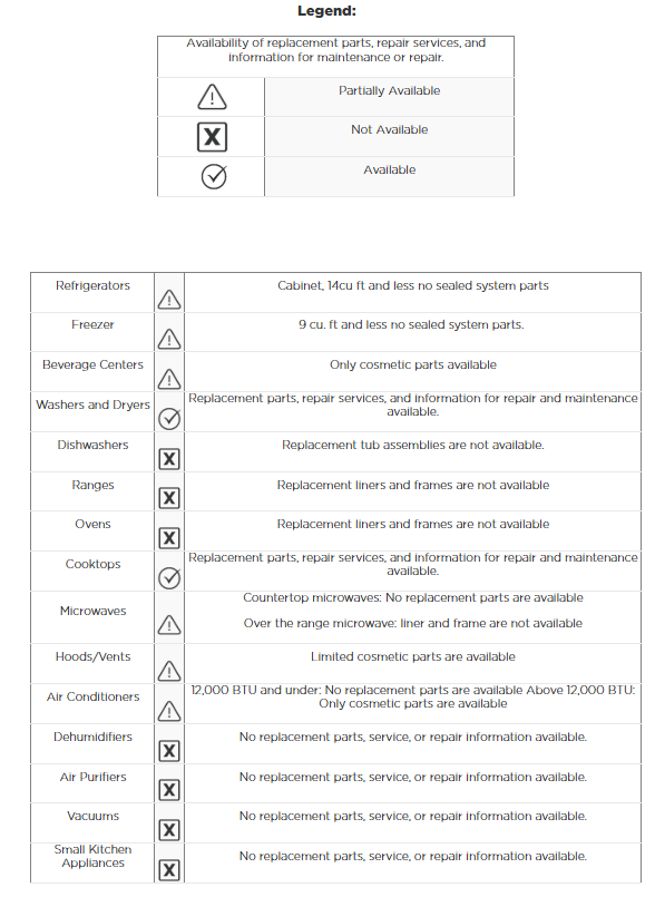 Though most parts are available for purchase, subject to short-term availability constraints, the following appliances and parts are not serviceable.