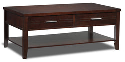 The Gloria coffee table is a fine study of form and function. The handsome design puts clean lines, bar hardware and open shelving to good use, and the deep espresso finish and natural graining really make the structure stand out. Simple line carvings on the flat-panel drawer fronts add a lovely touch of craftsmanship. Customer assembly is required.
