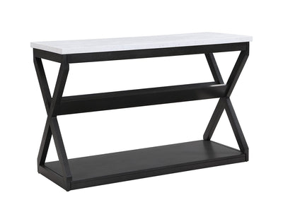 The Hadyn Sofa Table will be the perfect addition to any modern home. With genuine marble veneers over durable engineered wood, this sofa table gives you the look and feel of true marble without the cost and weight. The wooden base in a dark grey painted finish further adds elegance to this piece. The lower open display shelf is perfect for displaying pictures and books, while making it easy to move items. Supported by X-shaped framing this sofa table will be sturdy, and it still plays into the elegance of this piece. With this transitional design the Hadyn Sofa Table will bring any modern home together.Product Dimensions: Height: 30", Length: 48", Width: 18",