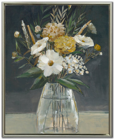This still-life wildflower bouquet in a glass vase captures rustic charm with earthy tones. Suitable for farmhouse or cottage-style decor, it brings warmth and a natural, cozy feel to interiors.Product Dimensions: Depth: 1.5", Height: 31", Width: 25",