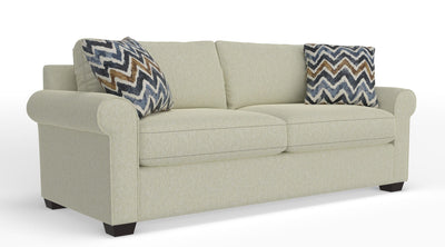 Experience comfort with the Jayden Sofa. This sofa has a contemporary look that will match any living room décor, which will make this couch a staple piece in your home. The rolled arms add a timeless elegance and tradition charm to your home. Relax your arms or head comfortably on the arms of this sofa. The seat and back cushions are reversible making it perfect for preserving the cushions so you can enjoy your sofa longer. The combination of kiln-dried hardwood, softwood, and engineered wood ensures a strong and durable frame, so your sofa will stand the test of time. The subtle look of the espresso wood legs ensure stability. With the high-performance fabric this sofa is easy to clean so you are able to relax without a worry while having a snack or drink. Two accent pillows are included to make your sitting experience extra cozy. Enjoy your time on the Jayden Sofa while watching a movie, reading a book or hanging out with friends and family.Product Dimensions: Depth: 37", Height: 35", Width: 84",