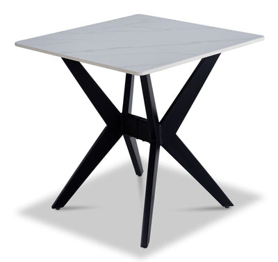 Elevate your living space with the sleek sophistication of the Kalani 21.75" End Table in White Sintered Stone and Black Metal. Combining modern design with cutting-edge materials, this table brings both style and durability to the forefront. The white sintered stone tabletop mimics the upscale look of natural marble, with soft veining and a smooth matte finish that feels as luxurious as it looks. Crafted from 8mm sintered stone, it offers a scratch-resistant, stain-resistant, non-porous surface that’s also resistant to extreme temperatures—hot coffee mugs and cold drinks are no problem here. Plus, it's easier to clean and maintain than real stone, giving you all the glam with none of the stress. The sturdy metal trestle base features a matte black powder-coated finish for a bold contrast and added durability. With a weight capacity of 85 lbs, this side table is as functional as it is stylish—ideal for everything from hosting guests to casual lounging with snacks and décor. From its glam-meets-industrial aesthetic to its ultra-resilient materials, the Kalani End Table brings a designer look into everyday living. It's a statement piece that effortlessly blends beauty and strength—just the kind of combo every modern living room needs.Product Dimensions: Height: 21.75", Length: 21.75", Width: 21.75",