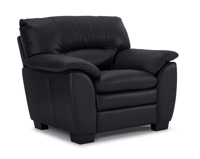 Discover the comfort the Kendrick Leather Chair has to offer. Made with 100% genuine leather, where the body touches: it provides a luxurious feel and a sophisticated appearance. The soft black colour will make it a statement piece in your home, turning heads and sparking compliments. Featuring a casual contemporary style, this chair blends seamlessly with any living room décor. The padded arms add to this chair’s luxurious feel, offering softness and support to enhance your comfort so you can truly relax. With no-sag springs and pillow-top seats, the cushion is crafted with 2.0lb density foam, delivering superior comfort and lasting durability for years to come. The outer frame is equipped with foam padding to protect the upholstery and minimize wear and tear, ensuring this chair is ready for whatever comes its way. Whether you're reading a book, watching movies, or chatting with friends, the Kendrick Leather Chair offers the perfect combination of comfort and durability.Product Dimensions: Depth: 39", Height: 40", Width: 43",