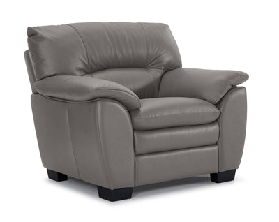 Discover the comfort the Kendrick Leather Chair has to offer. Made with 100% genuine leather, where the body touches: it provides a luxurious feel and a sophisticated appearance. The soft grey colour will make it a statement piece in your home, turning heads and sparking compliments. Featuring a casual contemporary style, this chair blends seamlessly with any living room décor. The padded arms add to this chair’s luxurious feel, offering softness and support to enhance your comfort so you can truly relax. With no-sag springs and pillow-top seats, the cushion is crafted with 2.0lb density foam, delivering superior comfort and lasting durability for years to come. The outer frame is equipped with foam padding to protect the upholstery and minimize wear and tear, ensuring this chair is ready for whatever comes its way. Whether you're reading a book, watching movies, or chatting with friends, the Kendrick Leather Chair offers the perfect combination of comfort and durability.Product Dimensions: Depth: 39", Height: 40", Width: 43",